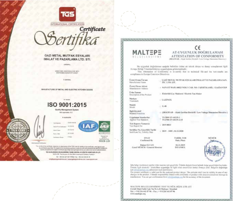 Tedariğini sağladığımız tüm ürün ve hizmetlere de katkı sağlayacak şekilde; ISO 9001:2015 Kalite, TS 2000 EN, TS 4788 En ve CE Belgesi standartlarına uyumlu hale getirdik ve sertifikalandırdık.